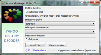 This software utility enables you to decode Yahoo! Messenger history log files, as well as view and save them to the hard drive as a LOG file. You are required to provide the path of the profiles directory with the help of a built-in file browser, select the profile and conversation you want to process with the incorporated drop-down menus, and choose the destination directory.