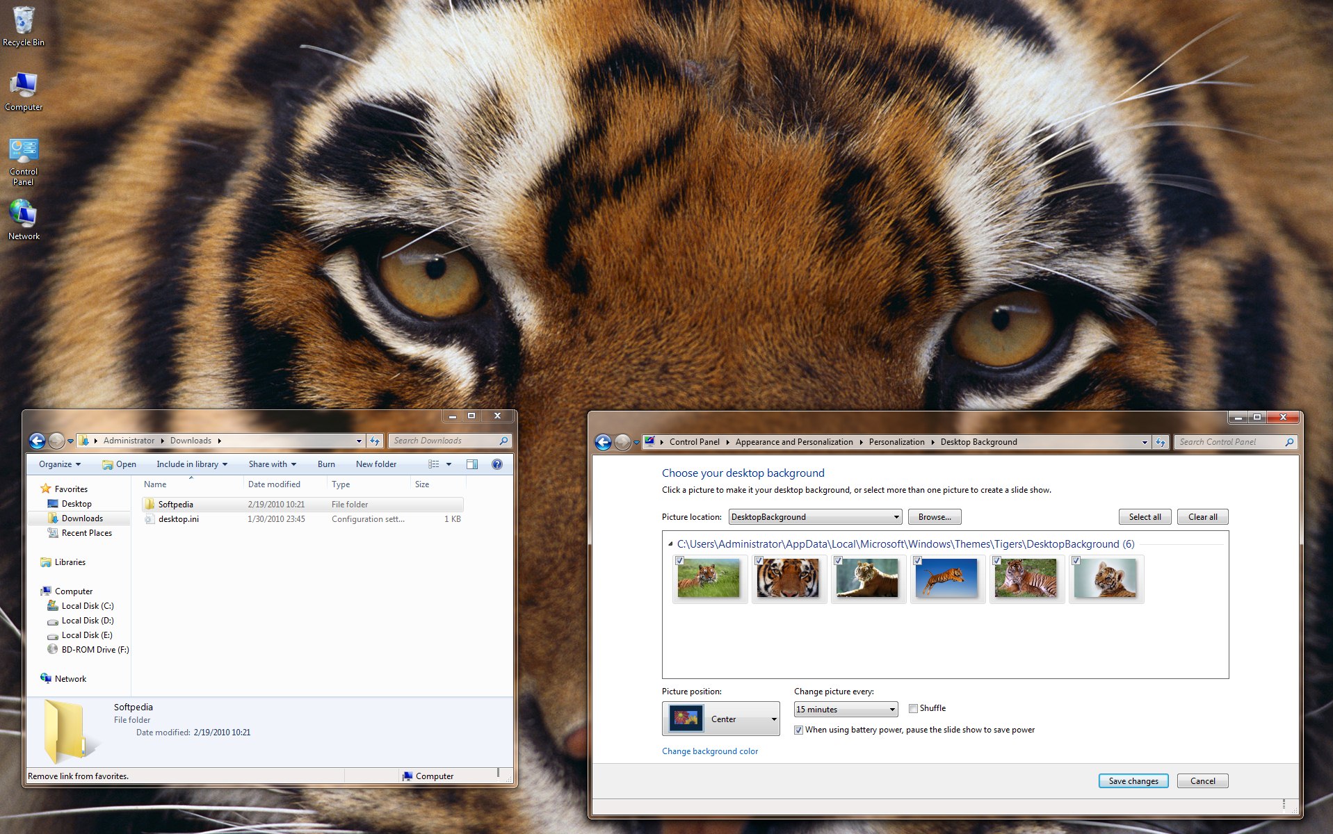 Once installed, the theme is automatically applied to your desktop. The pack includes six high-quality pictures, and each of them shows a Bengal tiger.
