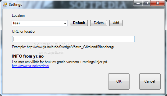 Setting up locations is done in configuration, you have to enter the url for the corresponding location example "http://www.yr.no/place/Norway/Oslo/Oslo/Oslo/" and thats it.System requirementsMediaPortal 1.2.x